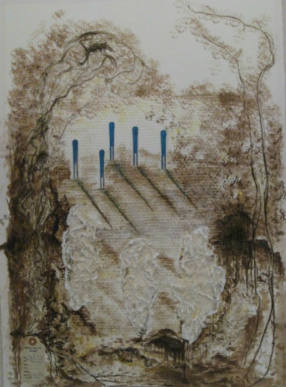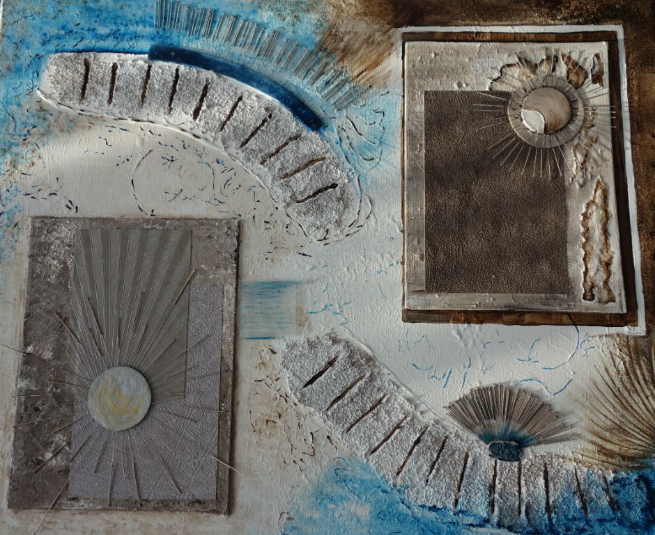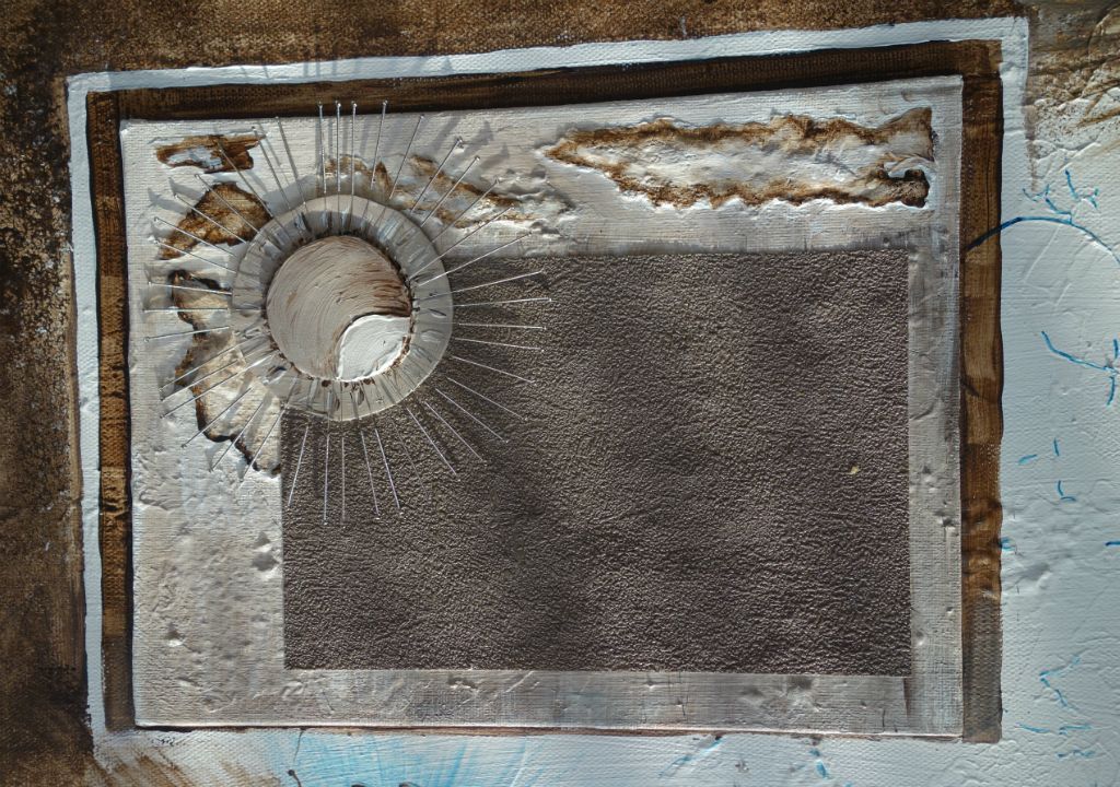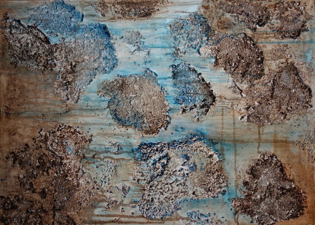abstract met papier, zand en aquarel