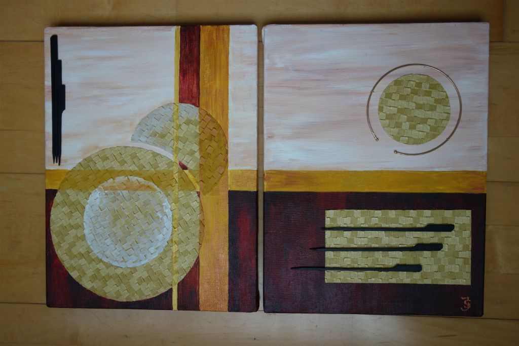 abstract met behangpapier en satéprikkers acryl tweeluik ieder 30x40 cm