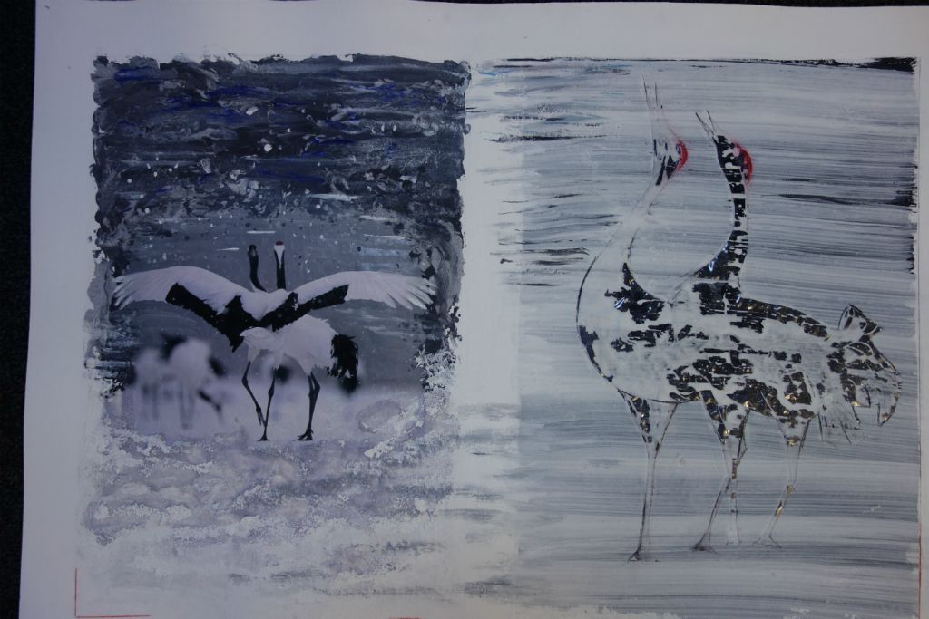 kraanvogels op karton, plastic en waterverf 70x50 cm