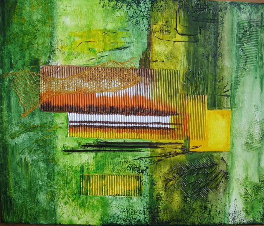 abstract groen met acryl, prikkers, sinasappelnetje en koekjespapier 50x60 cm