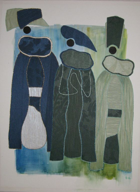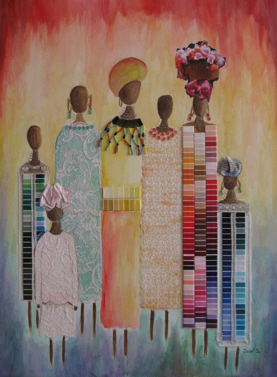 3 dames van behangpapier en aquarel 60x80 cm