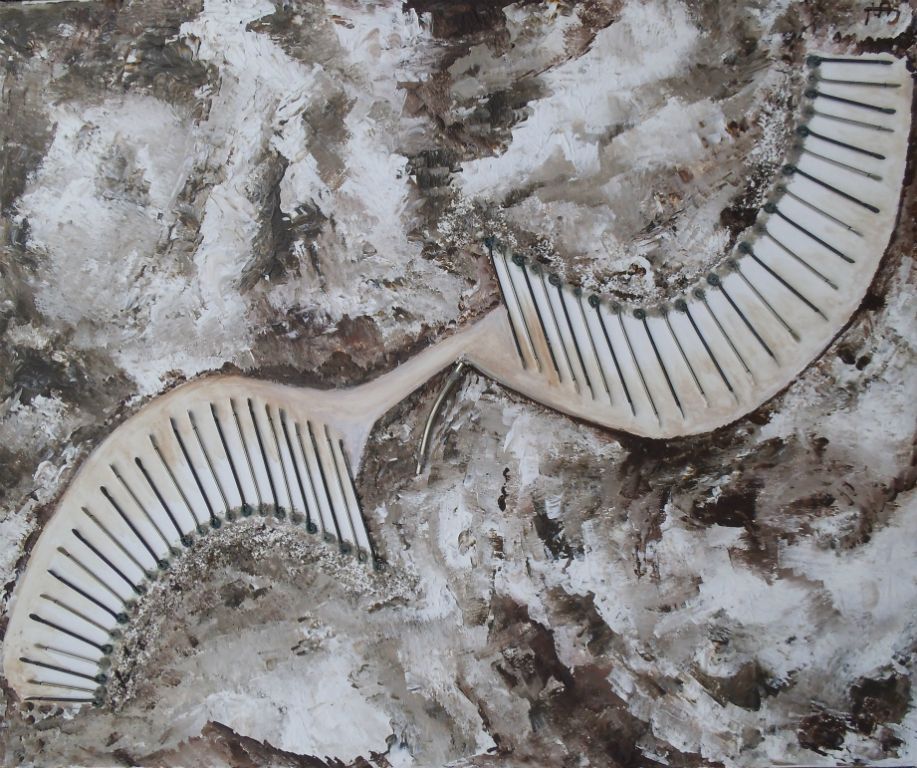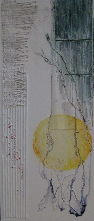 abstract met draadjes, jute en koekjespapier 70x30 cm