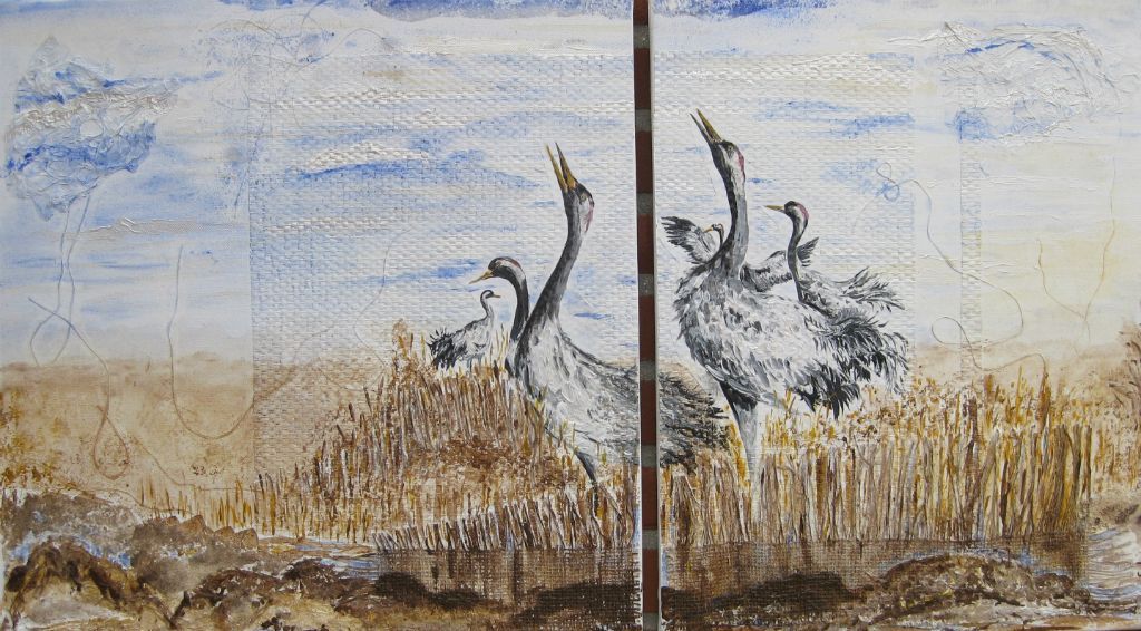 kraanvogels met jute, papier en acrylverf