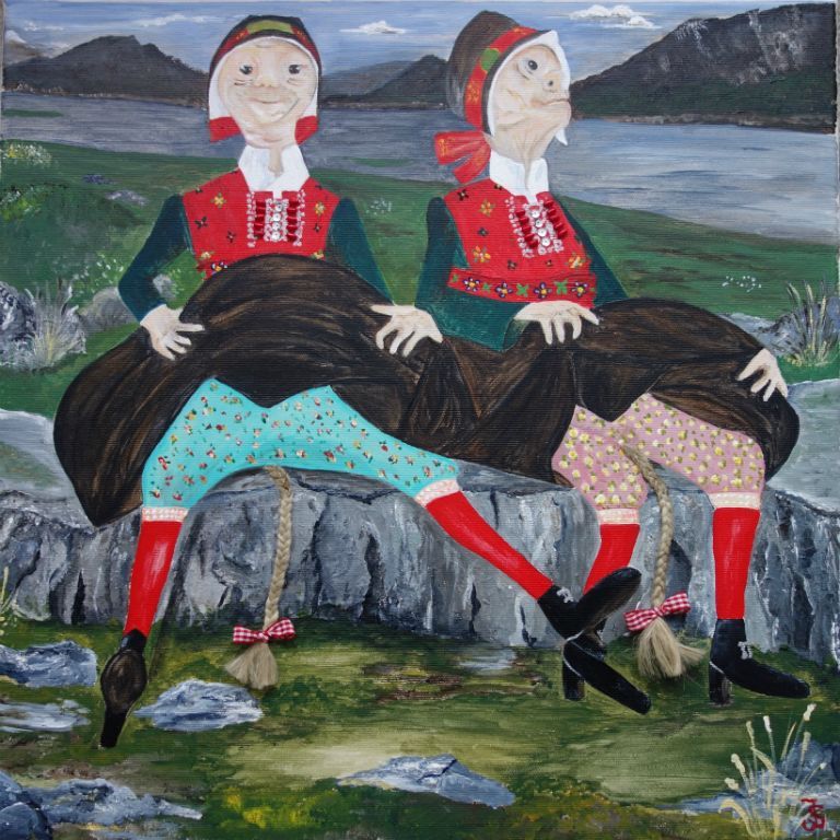 Noorse poppen met gevlochten staarten van vlas 60x80 cm niet te koop