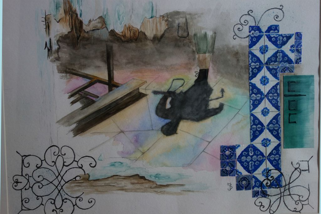 kerkvloer Portugal aquarel met zelfgemaakte tegeltjes 50x60 cm